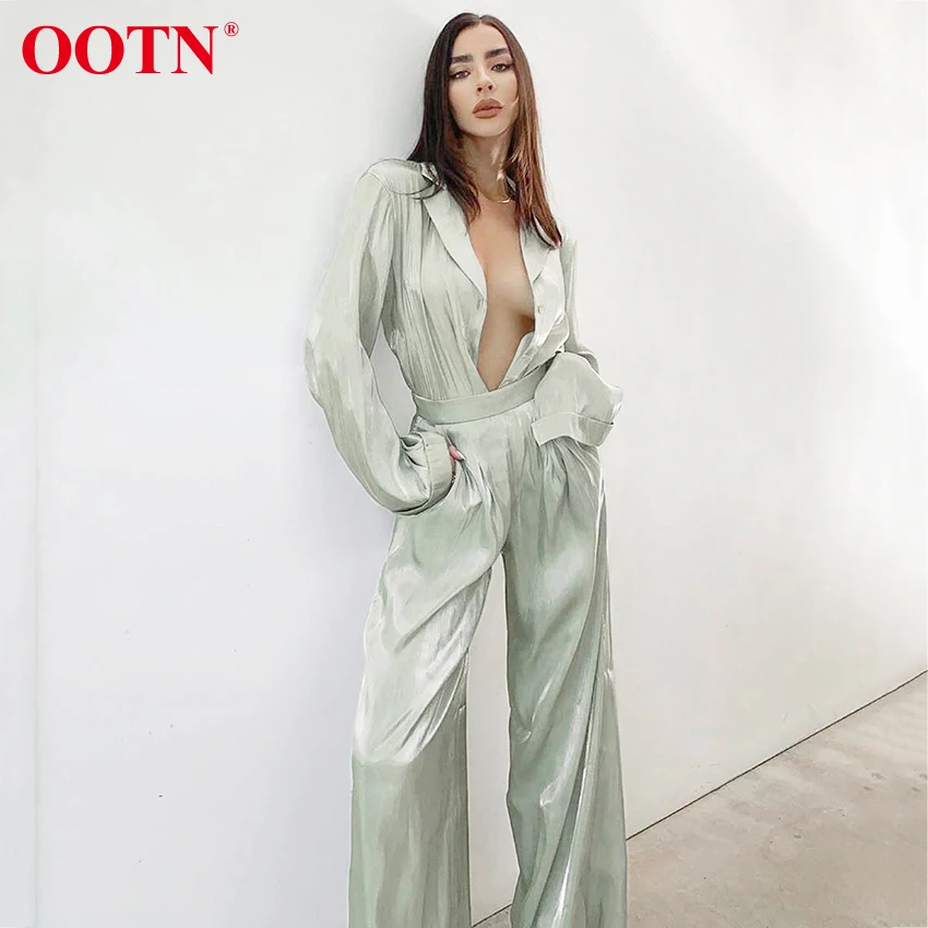 Best Suits & Sets from OOTN Official Store for Shirt Leg-Pants Trousers Women Two-Pieces-Set OOTN Long-Sleeves Elegant Female Green