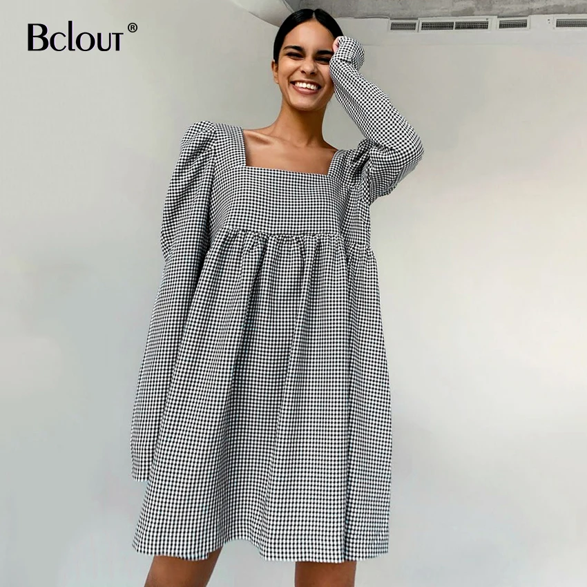 Best Dress from Bclout Store for Plaid Dress Puff-Sleeve Square Collar Bclout Black White Sexy Vintage Autumn Casual Woman