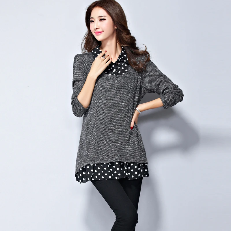 thanks to nkandby Official Store for Blouses Women Shirt Collar Ladies Tops Patchwork Knitted Long-Sleeve Loose-Turn-Down