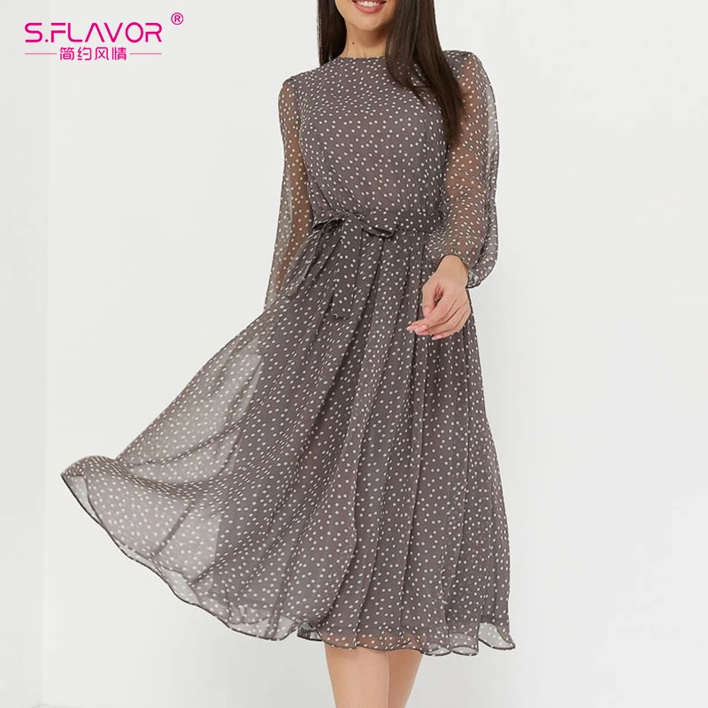 Best Dress from S.FLAVOR Official Store for Women Summer Spring-Dress Vestidos A-Line Long-Sleeve Dot Print Midi Chiffon S.FLAVOR
